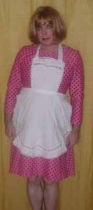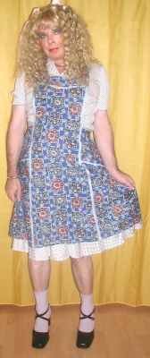 Weit geschnittene Baumwollschürze. Schützt das Kleid bis über den Po.