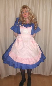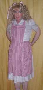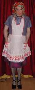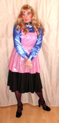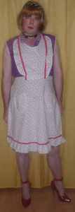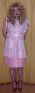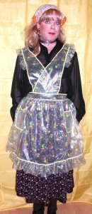 PVC-Schürze mit gekreuztem Latzteil. Mit Rüschen an Schuter und den gekreuzten Rückenbändern sowie am Saum. Besonders sinnvolle Bindetechnik in der Taillie.