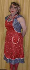 Rote Nylonschürze mit Halsschlaufe und Rüschenabschluss am Saum.